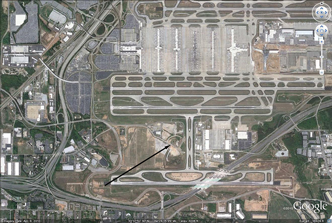 Construction of a fifth east–west runway began in the early twenty–first century and opened in the spring of 2006. Since it was expected to help alleviate airline congestion up and down the East Coast, it was dubbed at the time the “most important runway in America.” At 9,000 feet, construction costs of the runway ran to $1.28 billion, which included two enormous bridges crossing I–285 as well as buying our and razing entire neighborhoods. The north–south taxiway between the east–west runways is less than five hundred feet to the east of Flat Rock cemetery.