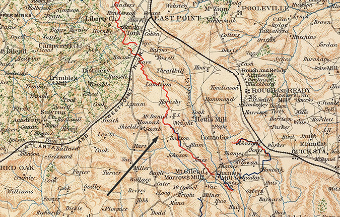 Detail from Plate LX, “Atlanta Campaign,” Atlas of the War of the Rebellion, 1864, annotated with an arrow to locate the future site of Flat Rock Baptist Church, between the Hart house on W. Fayetteville Road just north of Sullivan Creek and the Dodson house on Flat Rock Road just east of where the road crossed Flat Rock Creek, both houses designated on the map. |