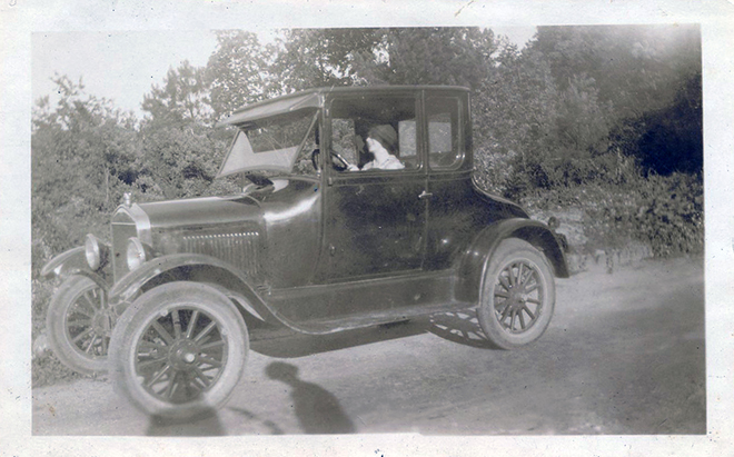 |   Ruby Lee in her Model A Ford, probably on Washington Road. |
