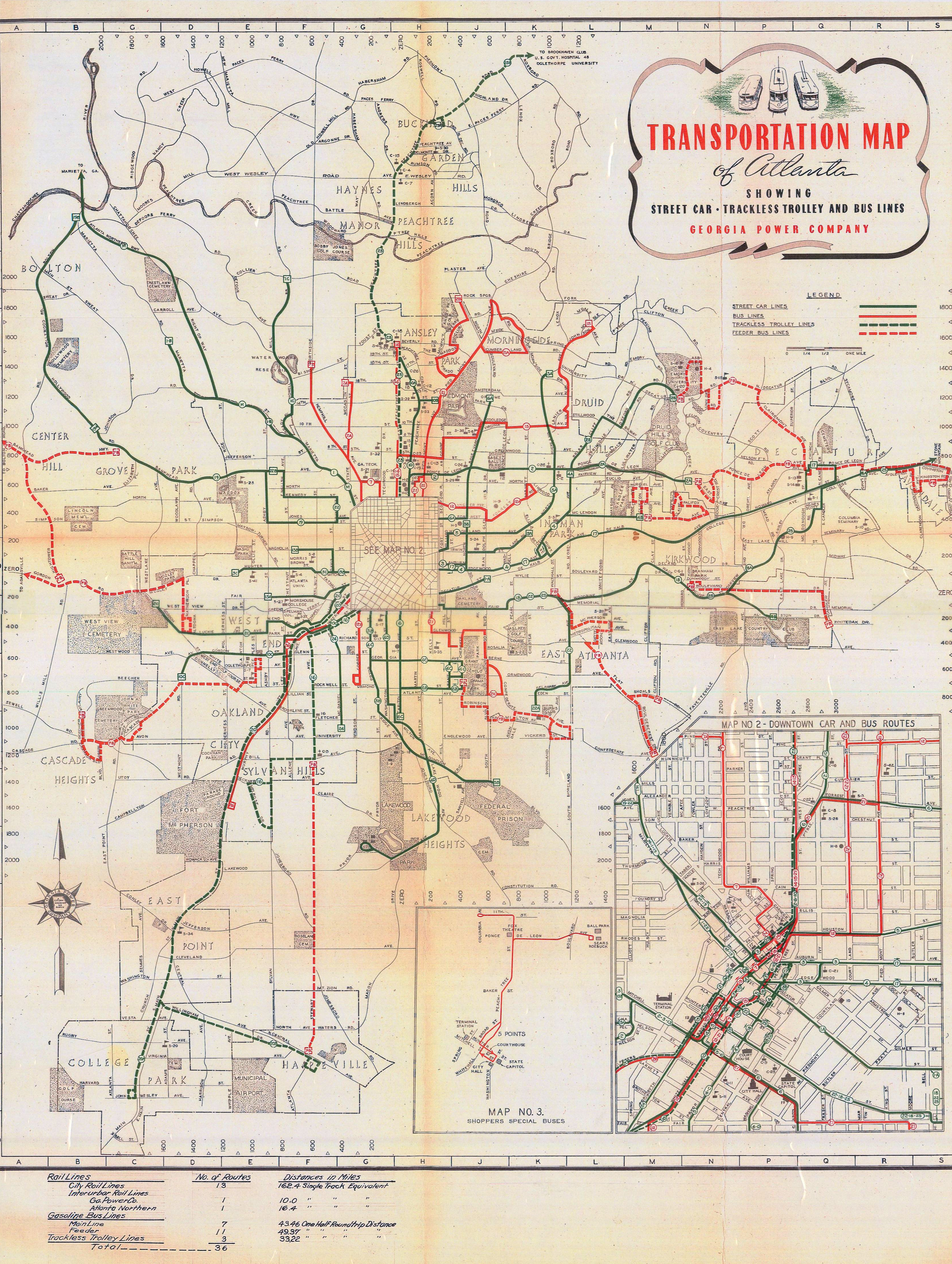 Georgia Power Company, "Transportation Map of Atlanta showing street car, trackless trolley and bus lines," 1942. (scanned from author's collection) |