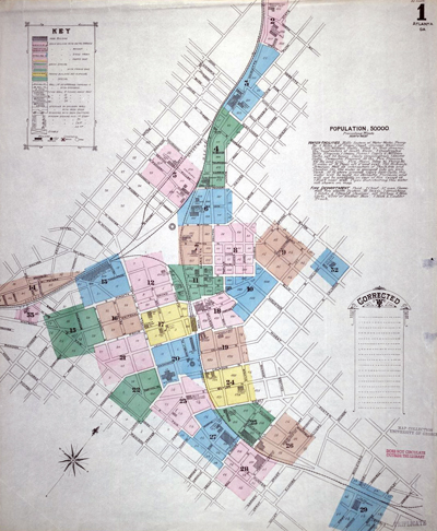 Index map to Sanborn Fire Insurance Company's maps of Atlanta in 1886, the first in a series of Sanborn maps that were produced periodically until after World War II. (Digital Libary of Georgia, <http://dlg.galileo.usg.edu/sanborn>, accessed 26 February 2013) |