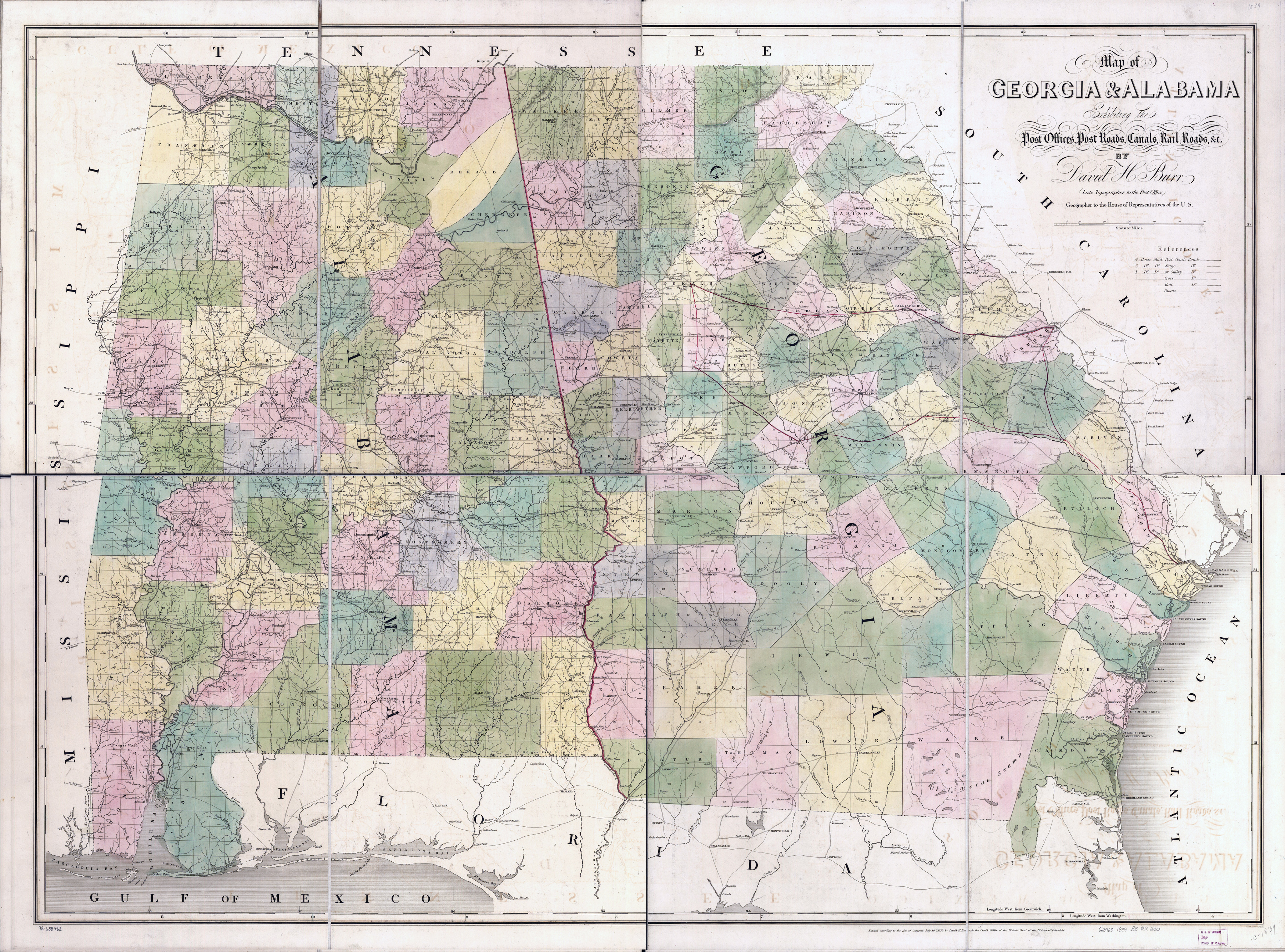 "Map of Georgia & Alabama exhibiting the Post Offices, Post Roads, Canals, Rail Roads, &c.," David H. Burr, from the American Atlas, published in London by J. Arrowsmith, 1839. (Library of Congress, Geography and Map Division) |