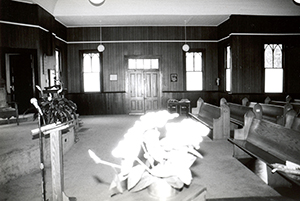 About 1970, some renovation of the building began. Sheet paneling was installed over the plaster walls of the building and, in 1977, the original pews were replaced and the sanctuary carpeted. In the early 1980s, another round of renovations occurred. An additional bath was added in the anteroom off the front porch. The metal roof of the building was replaced by the existing asphalt shingle roof over new plywood decking. About the same time, electrical service to the building was upgraded, but not the branch circuits within the building and the building’s gas space heaters were replaced by a central heating and air-conditioning system. The building was completely repainted on the exterior in 1996.