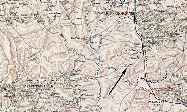 Phillip Fitzgerald was born during one of the largest and bloodiest of the several Irish rebellions against British rule, rebellion that was partially inspired by the ideals of the American and French revolutions. When French assistance failed to materialize, the British were able to brutally suppress the rebels and there were tens of thousands of casualties in the summer of 1798. Philip Fitzgerald’s father fought with the rebels, and his grandfather is believed to have died after being tortured by British troops. Guerilla action continued into the new century, even after passage of the Act of Union in 1800 that created the United Kingdom of Great Britain and Ireland. Little is known of Philip’s childhood and early manhood, and there is a confusion of information in the little genealogical information that has been recorded. Ireland remained a poor country in the early nineteenth century, with few opportunities for advancement and continuing resentment of British rule. There was relatively little Catholic immigration from Ireland in the early nineteenth century, partly due to somewhat greater religious tolerance. Several of the Fitzgerald children emigrated to America in the 1820s and 1830s, with the last of them arriving after the deaths of their parents in 1836 and 1837. At least two of the brothers—James (1791–1835) and Philip (1798–1880)—have been documented in Fayette County, along with another brother or uncle Michael Fitzgerald (1780–1864). All of them and a number of other family members are buried in Fayetteville City Cemetery. [5]