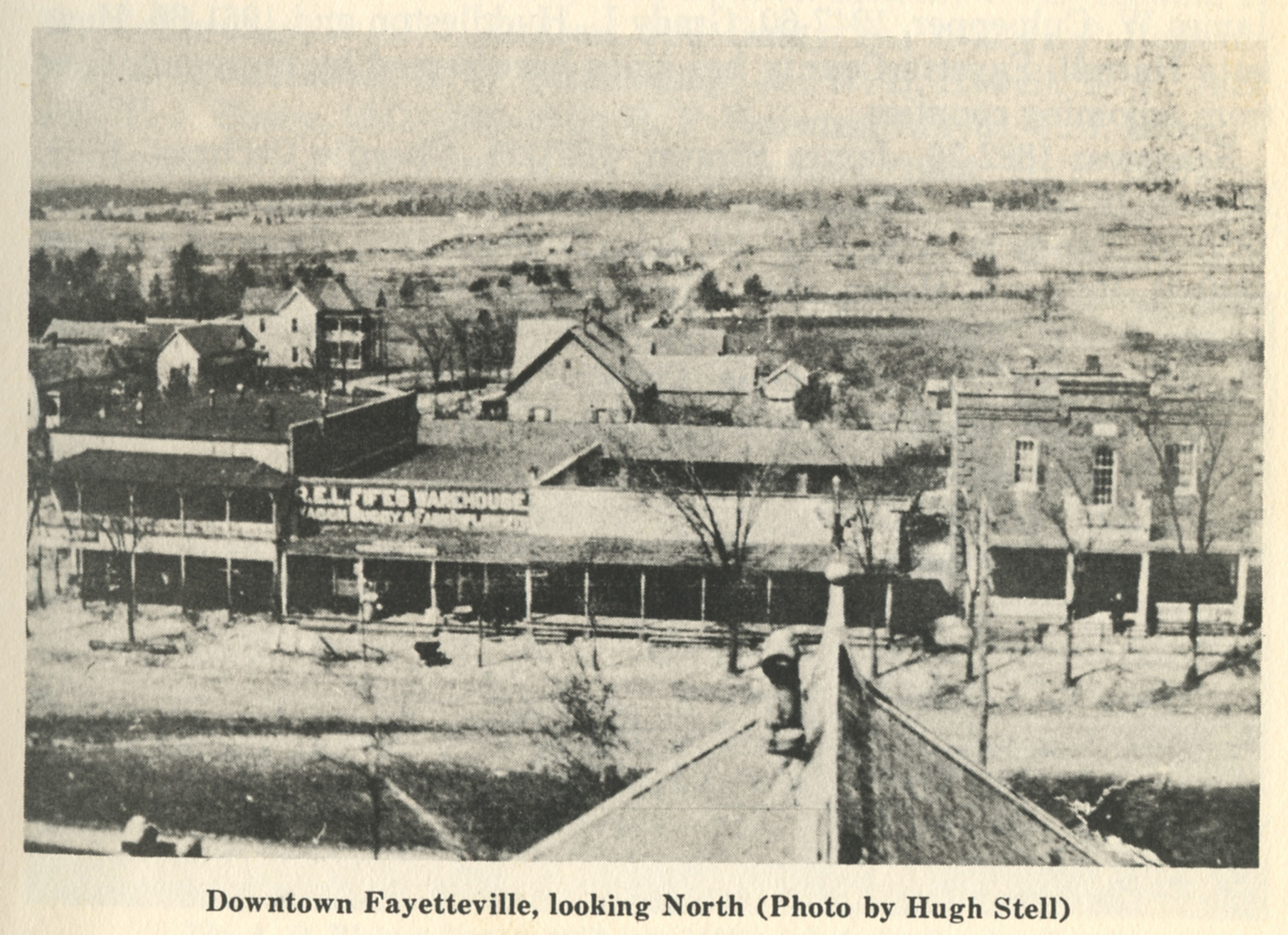 Fayetteville, the seat of justice, is a pretty town in the centre of the county. The courthouse is a very substantial and neat brick building . . . . There are two churches, two good schools, three stores, five groceries and several mechanics' shops along with a Masonic Lodge, a printing office and one Division of the Sons of Temperance. . . . The subject of education does not engage the attention of the people as much as it ought, although there are indications of a greater interest than formerly. S. R. Minor, now living, is 90, and editor of the Fayetteville Advertisor [sic]; says he owns the original type of Dr. [Benjamin] Franklin.[4]
