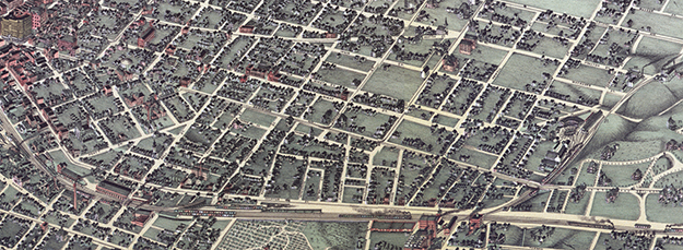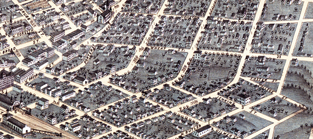 Figure 7. Detail from Saunders's bird’s-eye view of Atlanta, 1892, showing Edgewood Avenue stretching from downtown to Inman Park. |