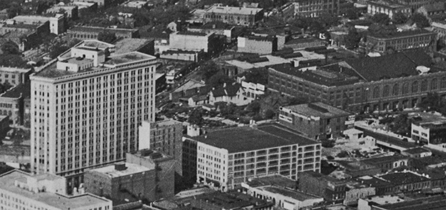 Figure 10. Detail from Parsifal Cobb’s aerial photograph of downtown in 1930. Future site of Hurt Park is at center, with the 1909 Municipal Auditorium and National Guard Armory right of center and the Hurt Building left of center. (Author’s collection) |