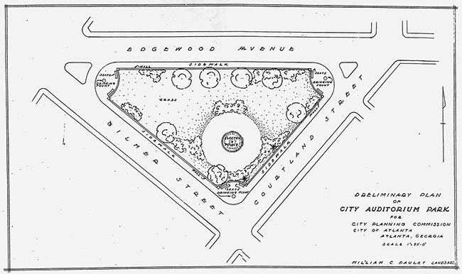 26. “Park Setting for Auditorium Suggested to Mayor Hartsfield,” Atlanta Journal, 6 March 1938. The exact date at which William C. Pauley was engaged to design the park is not known, but his preliminary design, which is undated, refers only to “City Auditorium Park” and so must predate the formal naming of the park in December 1939.