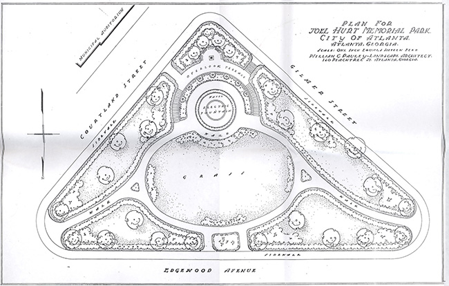 Although the gift was a surprise to most of the City Council, it was immediately accepted. At their regular meeting on December 18, Council passed a resolution naming the new park “Joel Hurt Memorial Park,” a name which had first been suggested by J. J. Haverty and which enjoyed wide support among older Atlantans especially. The Council resolution, which was approved unanimously, also requested that the Legislature place the park “in the list of Parks which can never be sold.” Mayor Hartsfield stated, “This is a splendid thing for the City of Atlanta, and a fine recognition of a man who helped make Atlanta the great city it is today.” The Mayor also noted that it was “especially fitting that this park, in the center of an area that . . . [Hurt] himself developed,” should be named in his honor. With the $40,000 that was included in the 1940 budget for the landscaping and walkways, development of a final plan for the new Hurt Park could move forward, although the total cost of the park would finally reach $85,000.