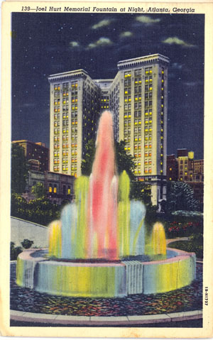 By the end of the War, Hurt Park’s reputation was firmly established. “At night,” the Journal reported in 1946, “the play of rainbow colors in the star-reaching spray is an attraction for whole families to drive downtown just to let the children watch the lights and colors come and go in the mist.” Whether they came to eat lunch, “waller in the grass” or just sit in their cars along Edgewood Avenue and watch the fountain’s display, Hurt Park and its “miracle of leaping waters and changing colors,” as one reporter described the fountain, quickly became a favorite of a generation of Atlantans. As Atlanta author Celestine Sibley wrote, it was “an authentic Sight and Wonder” and “we hauled all visitors to see it.” [43]