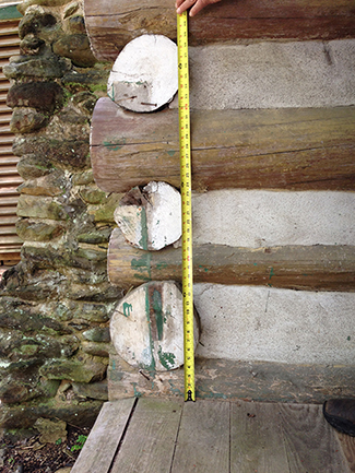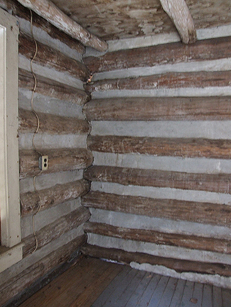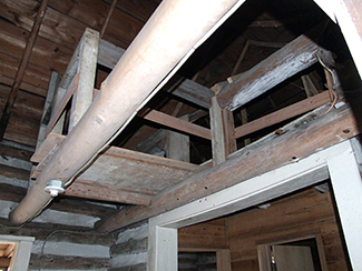 Tying the long walls of each pen together are cross beams inserted between the eighth and ninth logs and running perpendicularly between the long walls. Generally 7" to 8" in diameter, they create joists for a ceiling or attic flooring that appear not to have been part of the cabin's original construction, in part no doubt due to the labor necessary to flatten the tops of the logs enough to install flooring.