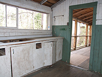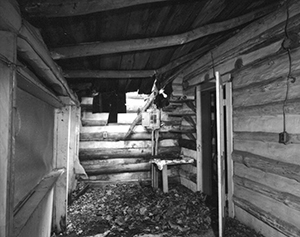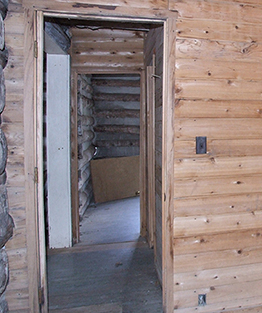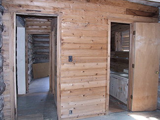 The late twentieth-century bathroom obscures evidence for placement of historic partitions in the southern log pen, but it was almost certainly partitioned in some way to form at least two bedrooms. There was no need for a kitchen in the original cabin since, at least in the early days, three meals a day were served in the clubhouse.