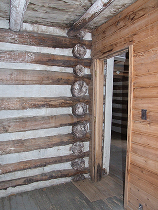 The gaps between all of the logs, as much as 5"-6" in some cases, could not be simply chinked without the addition of other material. To fill the interstices in the log walls, rough-sawn and split lengths of lumber were nailed in place to serve as a sort of lath for the hard, Portland cement used for the final chinking. The sawn ends of all of the cabin's logs have been painted white, a traditional way of providing some protection against water penetration on the rot-prone log ends.