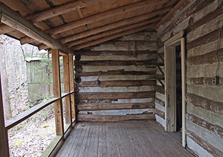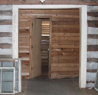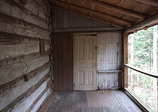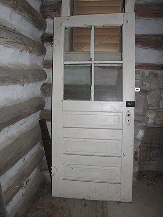 Shed-roofed porches have been partially rebuilt and, although both have lost their historic paneled balustrades, the two porches were apparently original features of the house. On the front porch, logs were used for posts to support the porch roof, each post having pole braces to the header. Only one original post and none of the braces remain intact. The balustrades visible in later photographs appear to have used nominally 2” by 4” or 5” boards to form top rails, which were set about 24” to 28” above the floor. What may have been a nominally 4” by 4” board was shaped to form the bottom rail. Upright between the two rails, tongue-and-groove boards, perhaps 1” by 5”, were installed in a rabbet in the bottom rail with something as simple as 1” quarter-round holding them in place at top and bottom. The balustrade across the back porch was paneled in a similar way, but also included screening above the balustrade. Opposite the back door, a screened door opened out to a landing and a flight of steps that descended to the south.