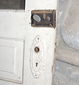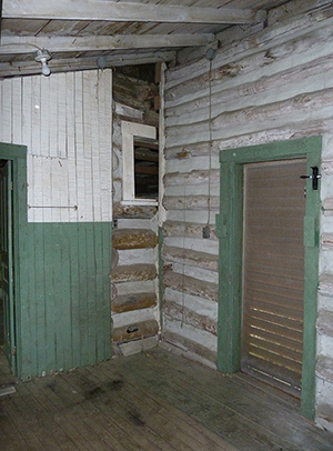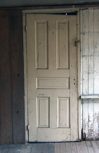 Doors: The exterior door opening on the west wall retains all of its original elements, but the five-panel wooden door (2'-6" by 6'-5" by 1") and its accompanying screen door have been removed from the frame. The exterior door opening on the south wall retains its original elements as well, but as noted earlier the five-panel door (2'-6" by 6'-5" by 1") has been altered.