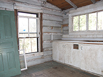 By that time there was almost certainly indoor plumbing, probably including a bathroom and a kitchen sink. [16] The kitchen remains much as it was built with doors on the south and west walls and windows on the north and east. Scorched flooring and the closed holes for a flue through the log walls and into the chimney suggest that cooking was done on a wood-fired stove set in the southwest corner of the room.