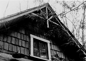 The three gables were finished with split wooden shakes; the front and rear gables retain decorative, vaguely Stick-Style trusses made from short lengths of peeled log poles.