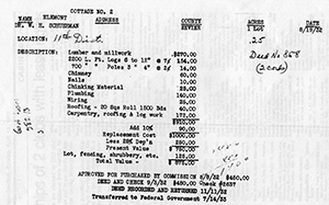 The Schuermans continued to own two cabins in the spring of 1931 when the Federal government began appraising the property at Elkmont in anticipation of its acquisition for incorporation into the new Great Smoky Mountains National Park. Summaries of the appraisal of each property at Elkmont are preserved on typed index cards and include two cards associated with the Schuermans. [15] Although the information on the two cards is somewhat muddled, the separate appraisals appear to account for the log house in Daisy Town and The Wigwam, the Schuermans’ cabin on Millionaire’s Row. In the appraisal for the Daisy Town cabin, Schuerman claimed ownership of a quarter acre of land. Replacement cost for the cabin itself was estimated at $1,000.
