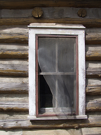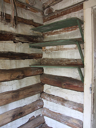 The kitchen wing, which was probably added in the 1920s, is essentially a three-sided log pen, with its fourth wall created by a board wall at the north end of the original back porch. The west wall of the kitchen terminates in the middle of one of the small windows at the north end of the original cabin.