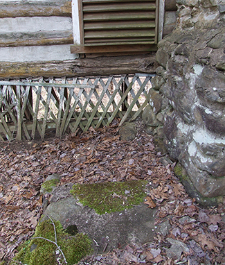 The log walls of the cabin are set on rock piers and wooden posts that, like most historic log buildings, appear to have no below-grade footings. Sills along the west (front) side of the house are set mostly on large flat stones placed directly on the ground, with additional stone stacked as necessary to meet the grade that falls away from southwest to northeast. At the southwest corner of the cabin, the sills at the south end of the front porch are within inches of the ground, but the ground falls 12" to 18" toward the north end of the porch and the northwest corner of the original log pen. Across the rear, the cabin is elevated around 36" above grade at the southeast corner and 68" at the northeast corner.