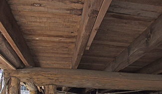 The roofs are decked with nominally 1" by 6" boards, butted to one another to form a closed deck. The patina of the wood suggests that most of the decking on the gabled roofs is original. Decking and rafters on the back porch have been recently replaced.