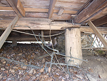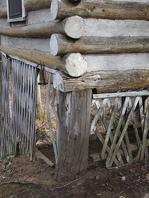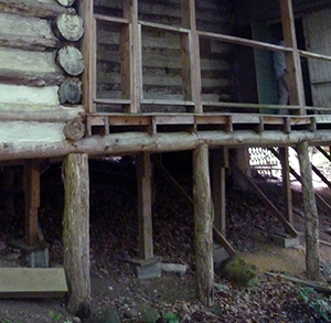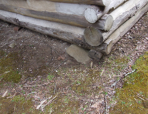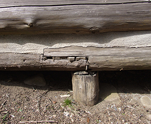 Most of the center and east side of the house rests on wooden posts set on flat rocks placed directly on the ground. In some cases, the wooden posts themselves appear to have been set directly on the ground or else the associated rock footing has been buried by eroded material. All of the historic posts are log, ranging in diameter from 4" to over 15". Many of the posts are still with their bark and at least some are black locust (Robinia pseudoacacia), indigenous to the southern highlands and renowned for its resistance to rot and insect damage.