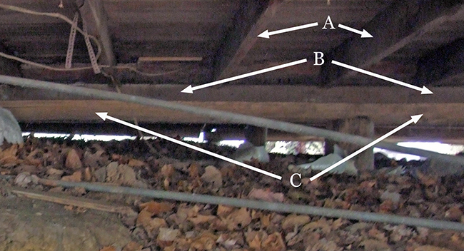 In recent repairs, a series of seven 3½" by 5½" sawn posts set on 8" by 12" concrete block have been installed to support sawn beams, 3½" by 7¼", added mid-span of the floor joists down the long axis of the back porch and kitchen. Contemporaneous with those are the diagonally installed braces, nominally 2" by 4". The house's foundation is completed by the original log beams that are set on these posts and rock piers. These run north to south underneath the outside wall and back porch at the rear of the house.