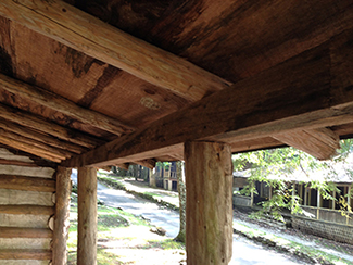 Roof framing was designed to be exposed and, in keeping with the rustic style, pole rafters were used. The rafters are slender, 3” to 4" in diameter, lapped and nailed at the ridge, but without a ridge board. A shorter length of a slightly smaller pole is used as a collar tie at each pair of rafters, but many of these are either broken or missing entirely. At the gables, top logs extend 24" beyond the wall of the house. Eaves on the south and east sides of the cabin are 10" deep. The eaves at the north end of the kitchen are 12" deep while those at the north end of the north log pen are 16" and those around the front porch are 14".