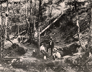 The first residents along Daisy Town Road drew water from a spring down the hill behind the Higdon and Addicks cabins, just south of the Sneed Cabin. Between the Sneed and Higdon cabins, the concrete steps that remain at the road and at the rear of the cabins most likely led to a wooden staircase to the community spring. [7]