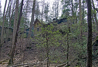 The Sneed Cabin is located near the end of the long plateau that descends between Jakes Creek on the west and Bear Wallow Branch on the east, just a few hundred yards south of where those two streams join the East Prong of Little River. The cabin fronts on a spur of Jakes Creek Road that runs along the spine of the plateau and is now part of a narrow, one-way drive through the historic Appalachian Club portion of Elkmont. The site slopes gently from north to south but also has a steep, rocky drop of over twenty feet to Bear Wallow Branch on the east (rear) side of the property. There appears to have been little effort given to leveling the site before construction of the building.