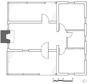 Twelve logs make up each of the walls in the original cabin, except on the west wall of Room 102 and the north wall of Room 101 where only eleven logs are present. The stacked logs create two intersecting log pens and the house's basic T-shaped floor plan. The largest pen forms a long rectangle 30'-2" west to east and around 12'-2" north to south. The smaller pen is around 12'-8" west to east and 20'-0" north to south.