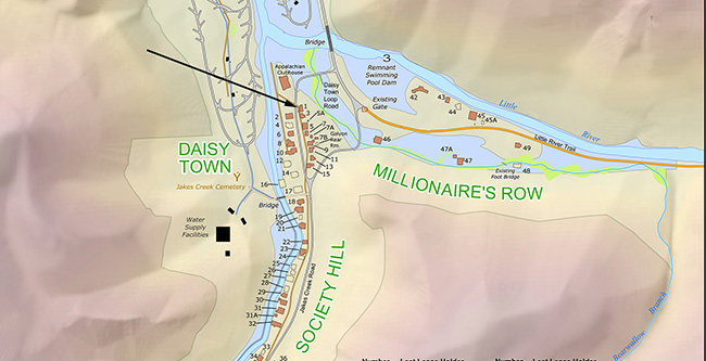 Figure 26. Detail from topographical map of Elkmont, annotated with an arrow to locate the Fulton-Sneed Cabin. (NPS) |
