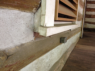 As already noted, ceilings were not a part of the house’s original design, and so there was no loft. In the last quarter or so of the twentieth century, a barely usable loft was created over the bedrooms and bath. It was accessed by a ladder, now missing, leading up to an improvised landing near the southeast side of the living room. Three-foot sections of the three logs at the top of the wall between the two log pens were cut out to ease access into the loft that was then created by laying 4’ by 8’ sheets of plywood, ¾” thick, across the widely spaced log joists above the bedrooms and bath. The final features that might be noted, albeit not perhaps historic, are the 6” K-style gutter and the brick steps at the front porch visible in photographs. The gutter appears to have been installed only over the front steps. No downspout is visible in the historic photograph, and it is likely the gutter was installed to direct rainwater run-off away from the front steps. The two brick steps spanning the opening to the front porch were laid flat in a stack-bond pattern and probably replaced wooden steps.