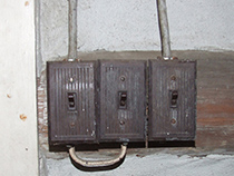 Electrical System: A keyless porcelain light fixture is mounted on a log joist at the center of the room, switched at the door to the back porch. A modern 220-volt outlet for an electric range is located in the southwest corner of this room.