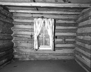 Windows: There are two windows in this room, one on the east wall and one on the south. Although the east window is missing its typical two-over-two sash, both were originally double-sash windows, 2'-5" by 4'-6", each fitted with cast-iron counterweights for the lower sash. The window on the south wall retains all of its historic features, including sash, trim, and hardware. Both windows have the same 1" by 4⅜" casing and apron and 2½" stool used elsewhere in the cabin. Brackets for curtain rods are attached at the top corners of the windows.