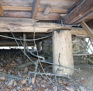 Most of the center and east side of the house rests on wooden posts set on flat rocks placed directly on the ground. In some cases, the wooden posts themselves appear to have been set directly on the ground or else the associated rock footing has been buried by eroded material. All of the historic posts are log, ranging in diameter from 4" to over 15". Many of the posts are still with their bark and at least some are black locust (Robinia pseudoacacia), indigenous to the southern highlands and renowned for its resistance to rot and insect damage.