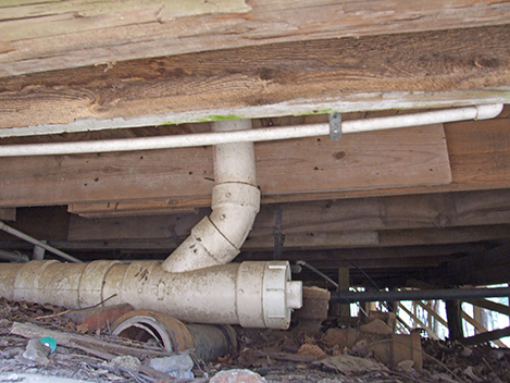 Figure 92. PVC waste line for bathroom, resting on an earlier cast-iron waste line.