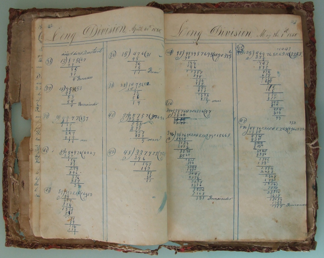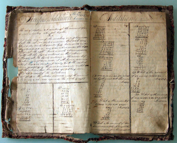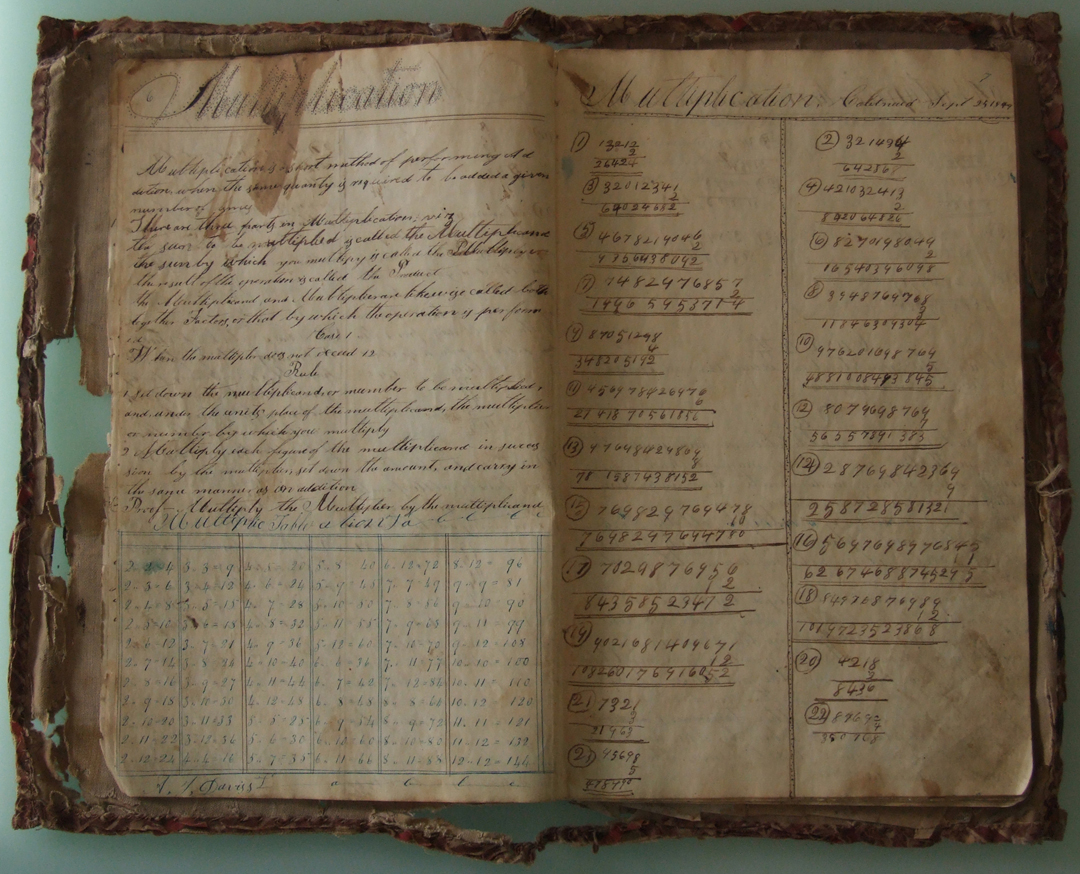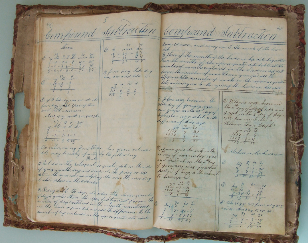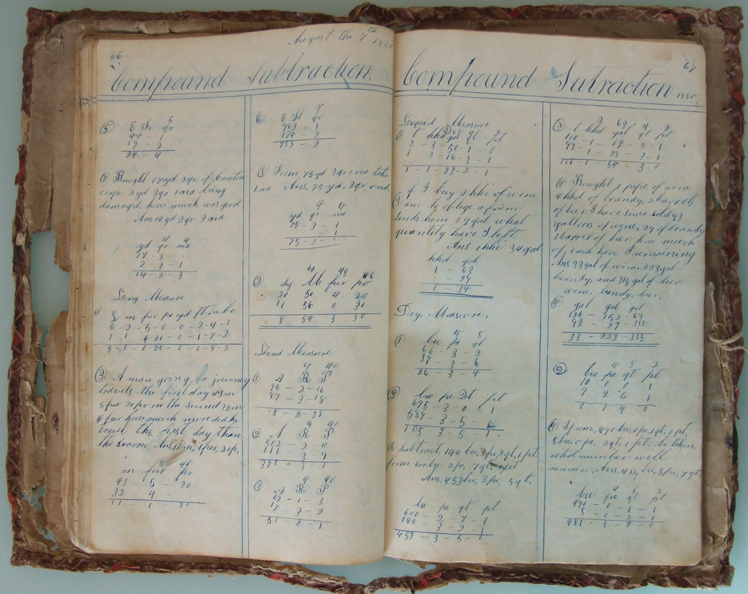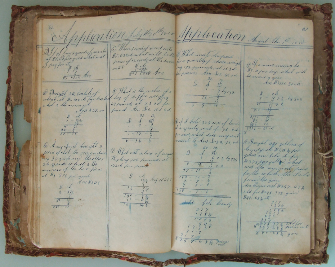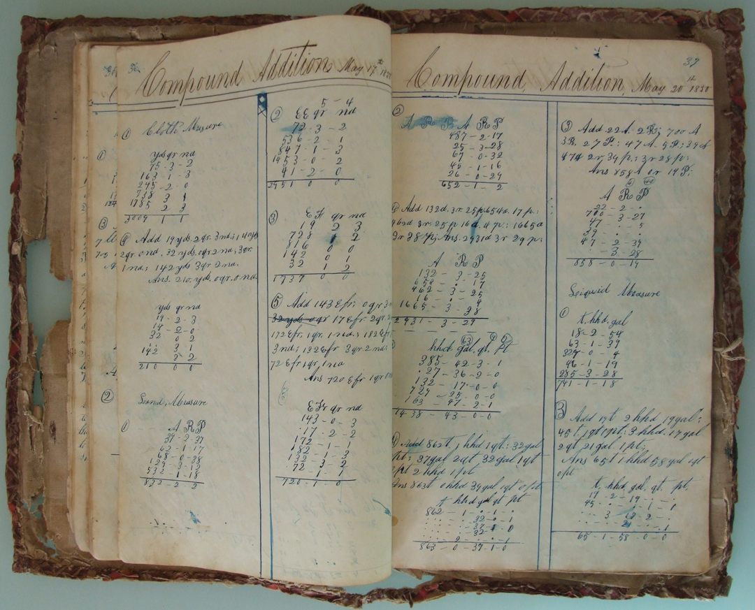 This copy book belonged to Andrew Jackson Davis (1829-1903), who used it for a variety of mathematical, penmanship, and other exercises, along with a few sketches, doodles, recipes, and poems. Written with pen and ink, the book's earliest date is 24 September 1847; the latest 1 March 1852.