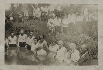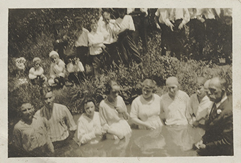 In addition to recreational use and watering livestock, the creek was used for baptismal services by Mt. Olive Baptist Church, which practiced full-immersion baptism, thus the denomination's name. In the vertical image below, the minister's right hand is raised as he prepares to deliver the baptismal blessing before briefly submerging the individual. The minister would have likely baptized all of the individuals standing in the water in this image.